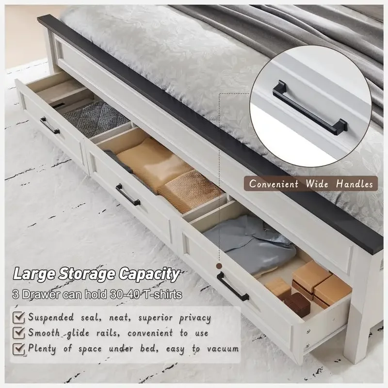 - Tall Footboard with Concealed Drawers: More than just a stylish addition, the 20″ tall footboard of our king bed frame offers practicality. Bid farewell to mattress sliding woes – saving the constant hassle of readjusting your mattress. 3 hidden drawers offer privacy storage, keeping your belongings dust-free. Furthermore, ample space beneath the bed simplifies cleaning with your floor care tools.
