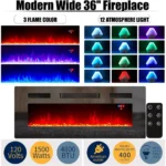 - 36″ wide modern low electric fireplace tv stand features 3 color realistic flame&5 level brightness,temperature control and time setting.750W/1500W Power heats quicker & energy efficient for max 4800 BTU output.Remote control included
